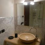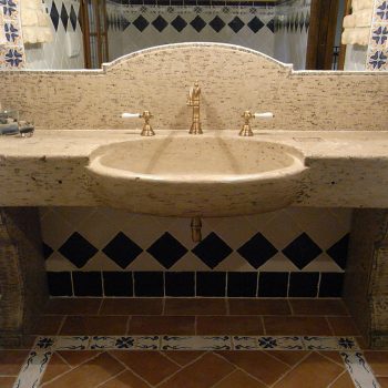 Lavello e piano in marmo Verdello di Asiago ricavato da unico massello di spessore 25 cm martellinato ed invecchiato a mano.