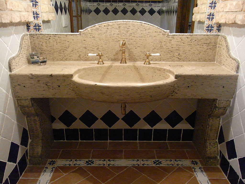 Rivestimento ricavato da lastra dello stesso marmo di spessore 3 cm martellinata ed invecchiata.